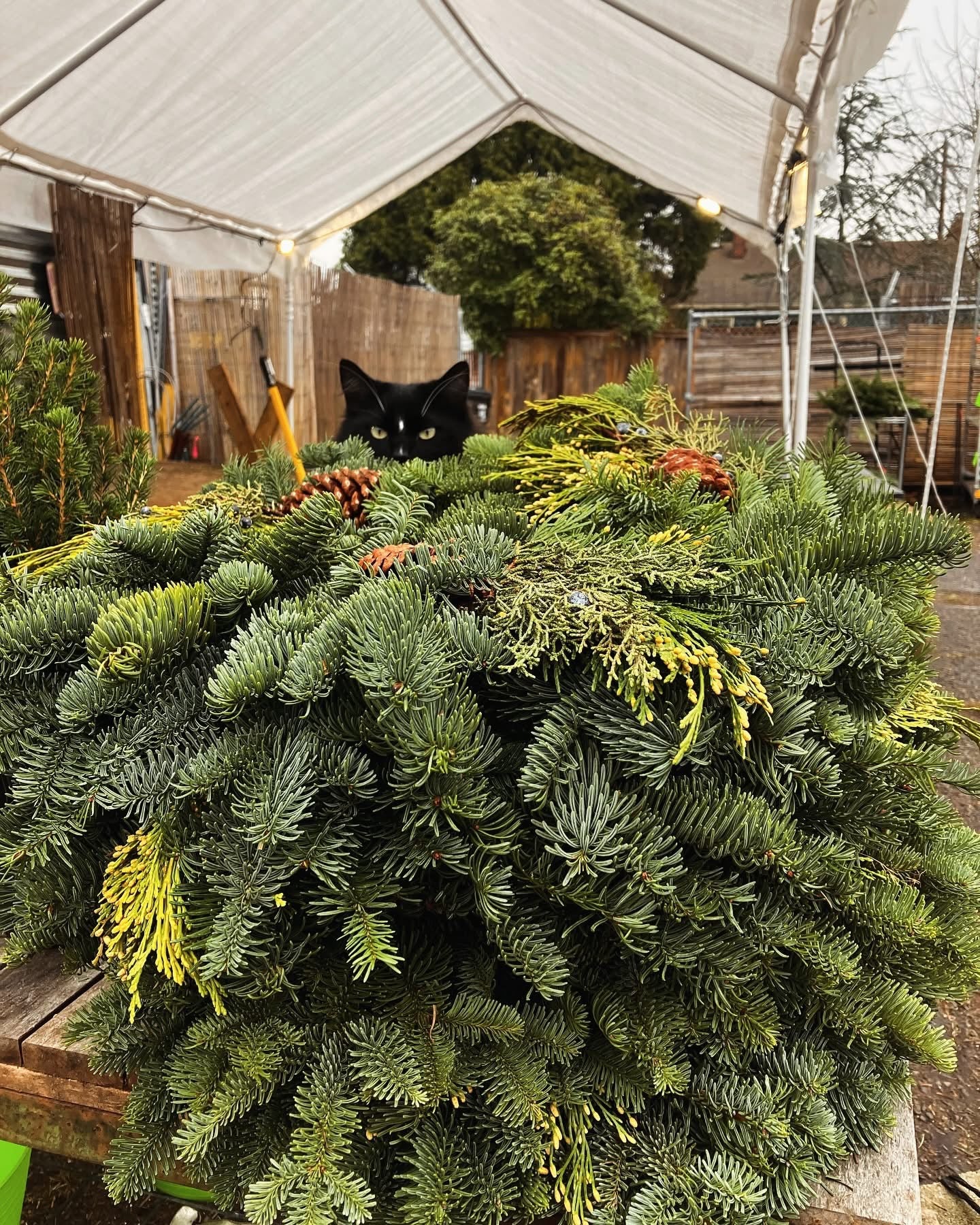 Not feeling a tree? How about some garland or a nice wreath? Or maybe some blooming paperwhites. We’ve also got lights, ornaments, and loads of great gifts, stocking stuffers and one very committed shop cat.